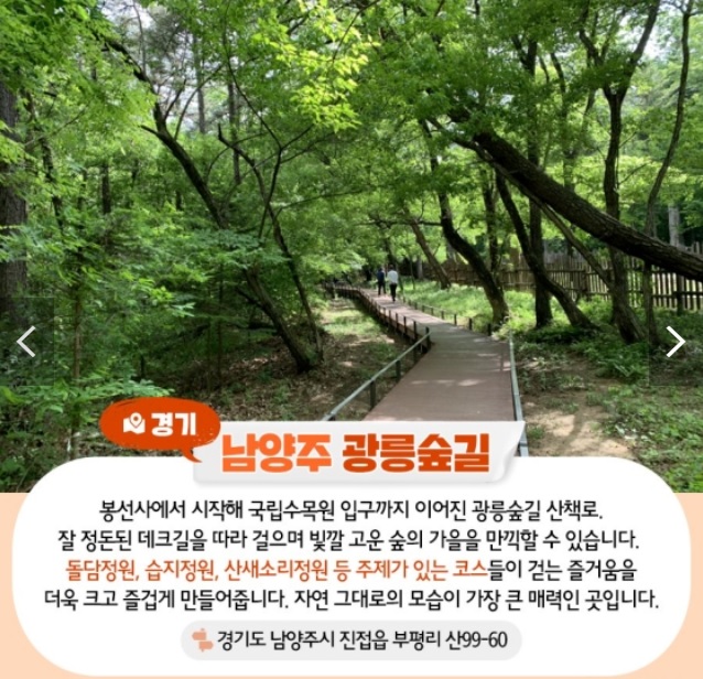 - 봉선사에서 시작해 국립수목원 입구까지 이어지는 광릉숲길 산책로입니다. 잘 정돈된 데크길을 걸으며 아름다운 숲의 가을을 만끽할 수 있습니다. 돌담정원, 습지정원, 산새소리정원 등의 테마코스는 산책을 더욱 즐겁고 즐겁게 해 줍니다. 자연 그대로의 모습이 가장 큰 매력입니다.