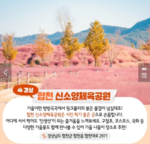 - 가을이면 방방곡곡에서 핑크뮬리의 붉은 물결이 넘실대었니다. 합천 신소양 체육공원은 사진 찍기 좋은 곳으로 손꼽힙니다. 어디에 서서 찍어도 '인생샷'이 되는 즐거움을 느껴보세요. 구절초, 코스모스, 국화 등 다양한 가을꽃도 만나볼 수 있어 가을 나들이 장소로 추천합니다.