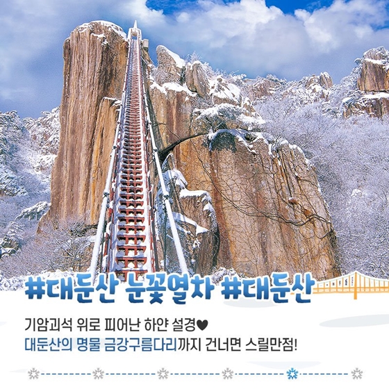 기암절벽의 웅장한 모습과 눈이 어우러져 우아한 설경을 자랑하는 대둔산입니다. 대둔산의 명물 금강구름다리에서 스릴을 맛보고 마천대에 올라 설경을 감상하고 있자면 마치 구름 위에 올라온 것 같습니다. 대둔산 케이블카는 현장예매만 가능하니홈페이지에서 운행여부를 확인해야 합니다. 겨울의 낭만을 즐기고 싶다면 대둔산으로 떠나보세요.