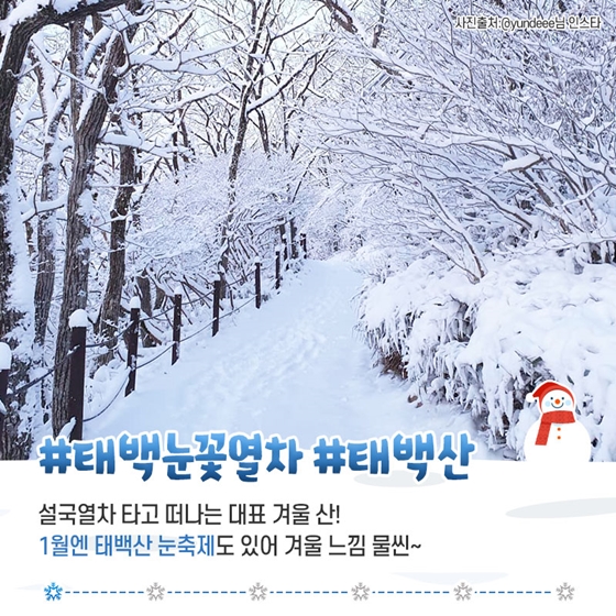 겨울에 빛을 발하는 눈꽃 산행의 진수, 태백산 하얗고 투명한 눈꽃을 따라 하얗게 물든 산을 오를 수 있는데요. 4~5시간 정도면 정상까지 다녀올 수 있습니다. 아직 미정이지만 24년 1월에 31회 눈축제도 개최된다고 하니 가족, 연인과 함께 방문해 보세요.