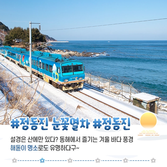 동해에서 겨울 바다를 즐길 수 있는 정동진입니다. 산에서 즐기는 설경보다 깊고 매력적인 겨울의 바다를 즐기고 싶다면 바다열차를 타고 그림 같은 풍경을 즐기며 정동진으로 떠나보시는 건 어떤가요? 해돋이 명소로도 유명한 곳이니 일출도 놓치지 마세요.