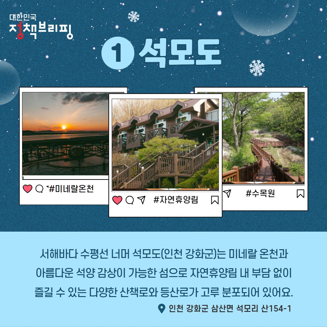 서해바다 수평선 너머 석모도(인천 강화군)는 미네랄 온천(현장구매)과 아름다운 석양 감상이 가능한 섬으로 자연휴양림 내 부담 없이 즐길 수 있는 다양한 산책로와 등산로가 고루 분포되어 있습니다.