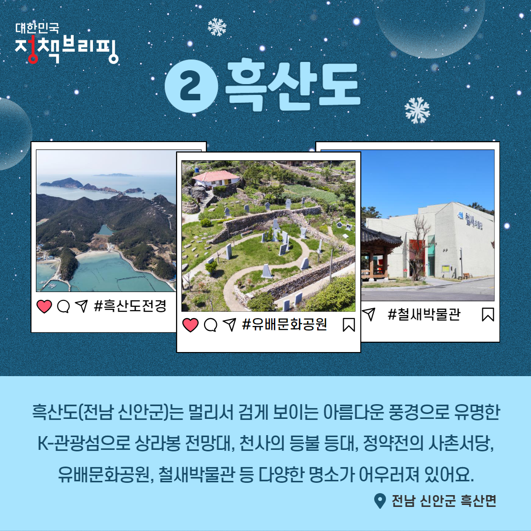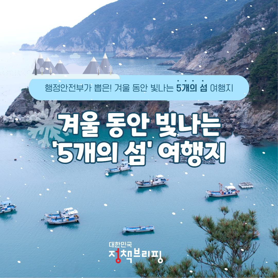 행정안전부가 한국섬진흥원과 함께 각 섬이 가지고 있는 지역별 고유한 특색을 알리기 위해 ‘찾아가고 싶은 겨울섬’을 선정발표했습니다. 이번에 선정된 겨울섬은 경남 통영시(장사도), 거제시(지심도)와 인천 강화군(석모도), 전남 신안(흑산도, 압해도) 등 5곳입니다. 올겨울은 따뜻한 온천과 동백꽃을 느낄 수 있는 섬으로 가족 또는 친구들과 함께 떠나보면 좋겠습니다. 아래에서 자세히 알아보겠습니다.