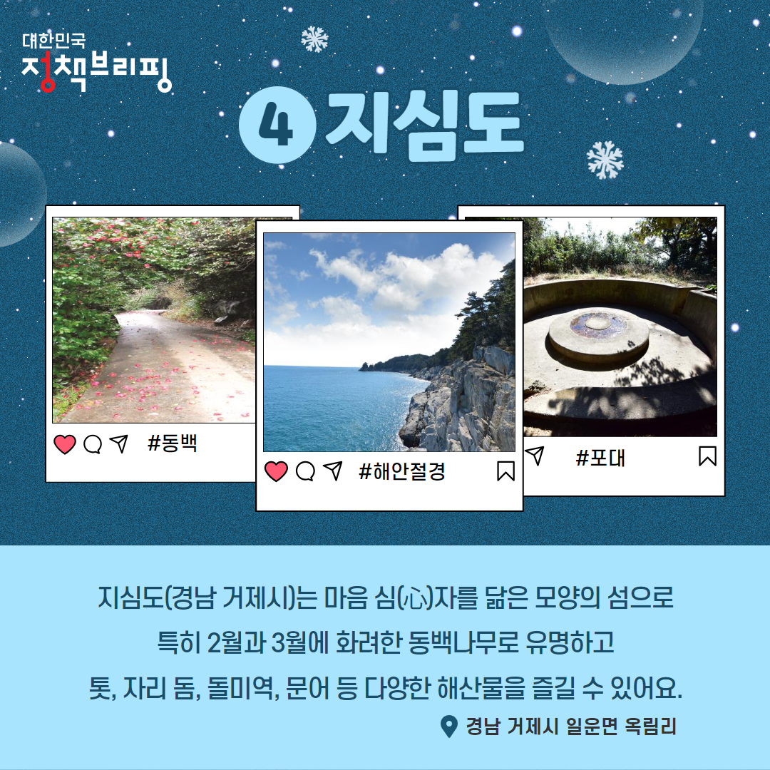 지심도(경남 거제시)는 마음 심(心) 자를 닮은 모양의 섬으로 특히 2월과 3월에 화려한 동백나무로 유명하고 톳, 자리돔, 돌미역, 문어 등 다양한 해산물을 즐길 수 있습니다.