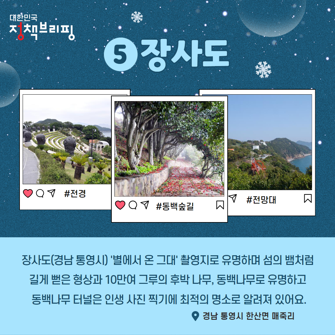 장사도(경남 통영시) ‘별에서 온 그대’ 촬영지로 유명하며 섬의 뱀처럼 길게 뻗은 형상과 10만여 그루의 후박나무, 동백나무로 유명하고 동백나무 터널은 인생 사진 찍기에 최적의 명소로 알려져 있습니다.