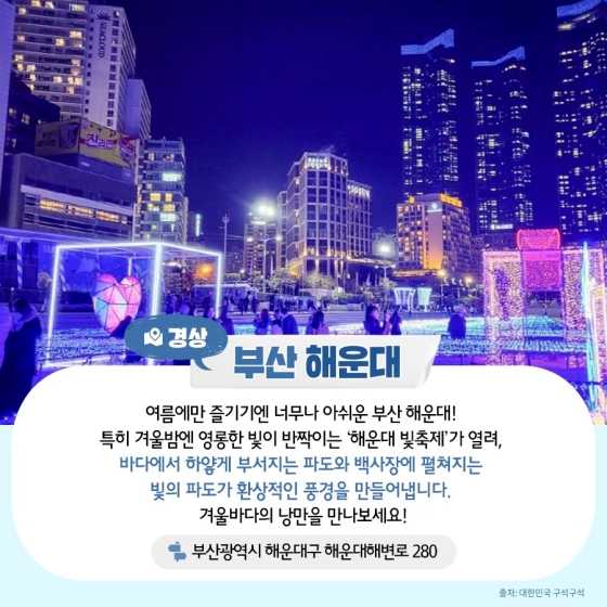 특히 겨울밤엔 영롱한 빛이 반짝이는 ‘해운대 빛 축제’가 열려, 바다에서 하얗게 부서지는 파도와 백사장에 펼쳐지는 빛의 파도가 환상적인 풍경을 만들어냅니다.