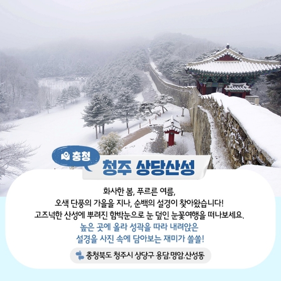 고즈넉한 산성에 뿌려진 함박눈으로 눈 덮인 눈꽃여행을 떠나보세요.