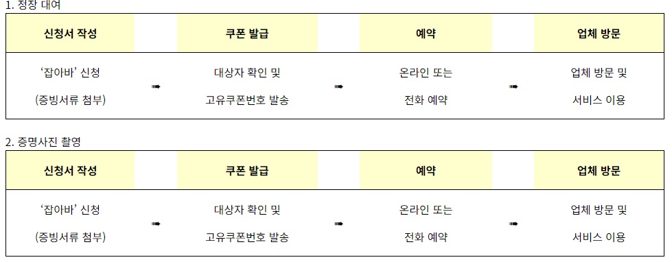 ※ 취업용 증명사진 무료촬영을 위해 정장 대여를 원하시는 경우, 첫 1회에 한해 워크넷 구직등록확인증 제출로 증명사진 및 정장대여 이용 가능