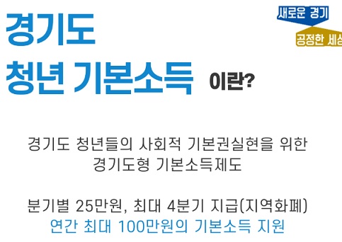 경기도가 청년의 사회적 기본권 보장을 위한 <경기도 청년기본소득> 신청을 받습니다. 청년기본소득은 경기도가 만 24세 청년에게 분기별로 25만 원씩 연간 최대 100만 원을 지급하는 청년지원정책입니다. 오늘부터 모집이 시작되는 3분기 경기도 청년기본소득 지원자격 및 신청방법에 대해 알아보겠습니다.