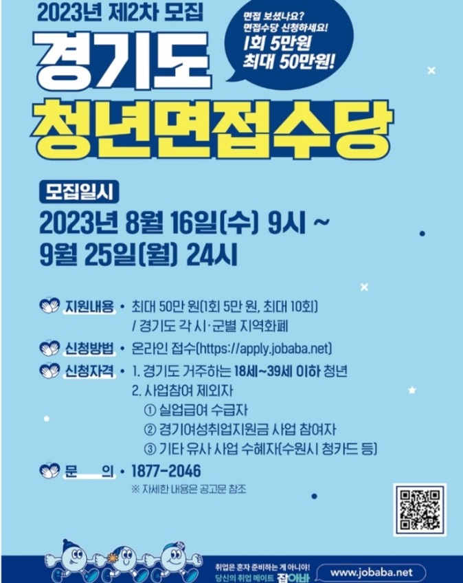 오늘은 취준생 지원금이라 할 수 있는 경기도 청년면접수당에 대해 알아보겠습니다. 적극적인 구직활동을 하는 청년들을 지원하는 경기도만의 혜택으로 최대 50만 원까지 받을 수 있습니다. 대상자라면 아래의 신청방법과 자격을 읽어보시고 신청하시기 바랍니다.