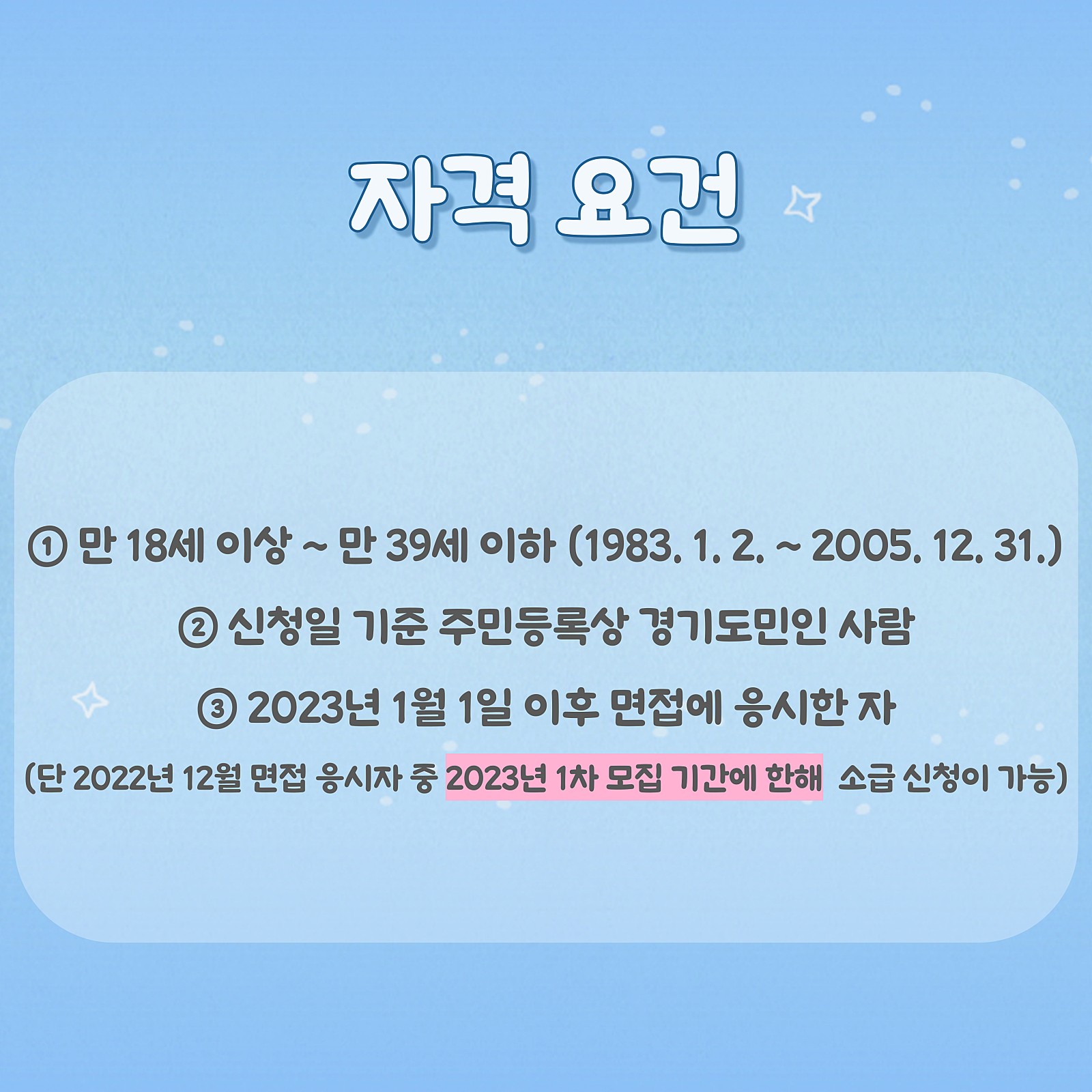 신청자격은 2023년 1월 1일 면접에 참여한 만 18세 이상 39세 이하로 신청일 현재 주민등록주소가 경기도인 사람이면 누구나 가능합니다. 특히 주 30시간 미만의 단기 일자리등도 신청을 할 수 있습니다. 그리고 경기도 이외의 사업장(해외기업 포함) 면접의 경우에도 신청이 가능합니다. 즉, 본인이 지원하는 기업이 경기도가 아니어도 되고, 아르바이트를 신청해도 면접수당을 받을 수 있으니 면접에 참여하면 꼭 신청을 하시기 바랍니다.
