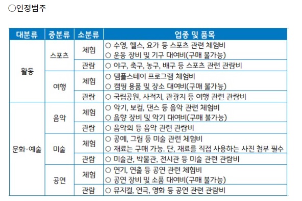 ○ 지원내용 : 스포츠, 음악, 미술 등에 대한 체험 및 관람지원(1인당 최소 30만 원~최대 40만 원)