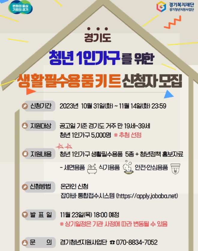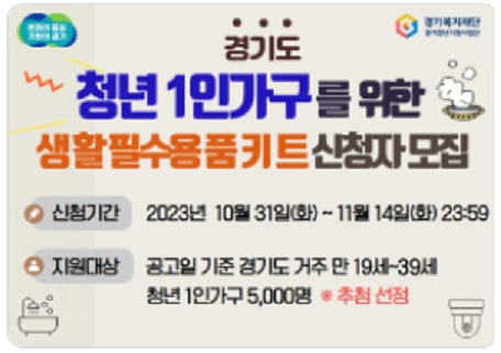 경기청년지원사업단에서 경기도 1인가구 청년의 안전하고 건강한 생활 지원을 위해 2023년 「청년 1인가구 생활필수용품 키트」 무료로 지원합니다. 선착순 5,000명만 지원하니 서둘러 신청하시기 바랍니다. 아래에서 지원자격 및 신청방법을 알아보겠습니다.