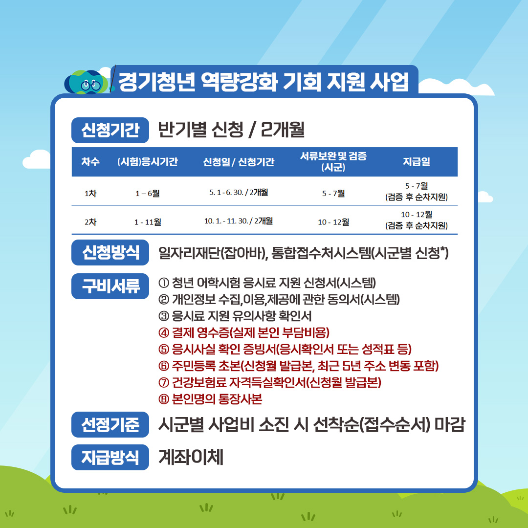 ▶ 경기 청년 역량강화 기회지원사업은 경기도에 거주하는 미취업 청년을 대상으로 어학시험 19종 및 국가자격시험 544종 민간자격 95종의 응시료를 지원하는 사업입니다. 지원 금액은 최대 30만 원이며, 실제 비용은 1회 최대 10만 원까지 연 3회 지원됩니다.