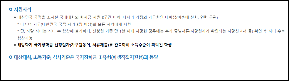 - 다자녀 국가장학금 : 국내 대학에 재학 중인 학자금 지원 8구간 이하의 세 자녀 이상 다자녀 가구의 대학생 중 성적 기준 충족한 자