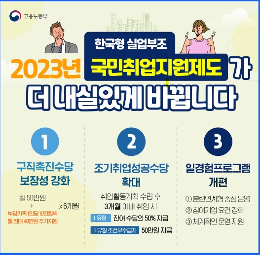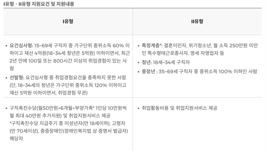 일할 수 있는 능력과 의지가 있지만 취업에 어려움을 겪는 사람들을 정부가 도와주는 제도를 말한다. 이 제도에 참여하면 구직 프로그램과 각종 수당 등의 서비스를 받을 수 있습니다. 참가자의 연령, 소득, 재산, 과거 근무 이력 등에 따라 제1유형과 제2유형으로 구분됩니다. 1 유형은 한 달에 최대 50만 원의 구직촉진수당을 6개월간 받을 수 있습니다. 그리고 2 유형은 프로그램 참여 결과에 따라 활동비용을 받을 수 있습니다. 또한 참가하는 분들이 취업이나 창업에 성공하면 150만 원의 성공수당을 받을 수 있습니다.