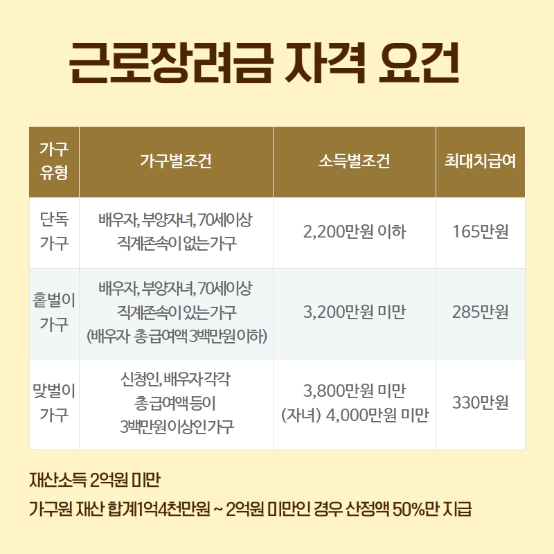 그럼 근로장려금 지급 기준을 좀 더 자세히 알아보겠습니다. 가구, 소득, 재산의 요건을 모두 갖추면 가능합니다 1인 가구인 경우 배우자나 부양자녀, 직계존비속이 70세 이상이어서는 안 되며 총급여액은 2200만 원 이하여야 합니다. 홑벌이가구인 경우 배우자, 부양자녀, 70세 이상 가구 중 1인 소득이 연간 300만 원 미만이고 3200만 원 미만이어야 합니다. 맞벌이인 경우 신청자와 배우자의 총급여액은 각각 300만 원 이상 3800만 원 미만이어야 합니다. 근로장려금 지급액은 전년보다 늘었는데, 최대치를 계산하면 단독은 165만 원, 홑벌이 285만 원, 맞벌이 330만 원을 각각 받을 수 있습니다.