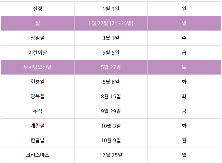 설 연휴는 1월 24일 화요일입니다, 부처님 오신 날의 대체 휴일은 5월 29일 월요일입니다! 이렇게 도어 2023년 공휴일 및 설, 부처님 오신 날 대체공휴일 주말을 합쳐 올해 쉴 수 있는 날은 총 117일입니다. 지금까지는 크리스마스, 석가탄신일, 대체공휴일 추가소식과 2023년 공휴일에 대해 살펴봤습니다.