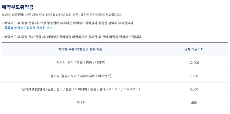 결국 국제 마일리지 항공권을 구입한 후에 미리 환불 없이 비행기를 타지 않으면 위 표의 거리 예약에 대한 추가 위약금과 함께 3,000마일을 추가로 지불해야 합니다.