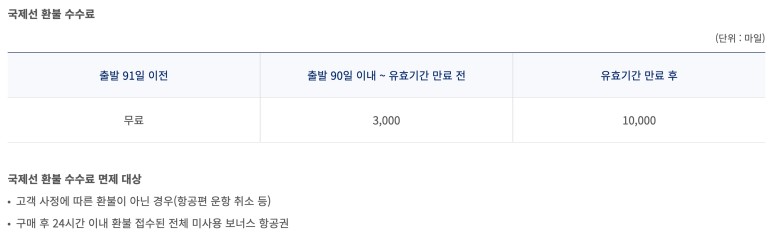 국제 환불 수수료가 조금 다릅니다. 출발 91일 전에 환불하시면 수수료가 없습니다. 그리고 출발 90일 전부터 만료일까지 3,000마일이 공제되고, 만료 후에는 10,000마일이 공제됩니다. 구매 후 24시간 이내에 무료 환불이 가능합니다. 유효기간은 비행기 출발과는 별도로 항공권의 유효기간을 말합니다.