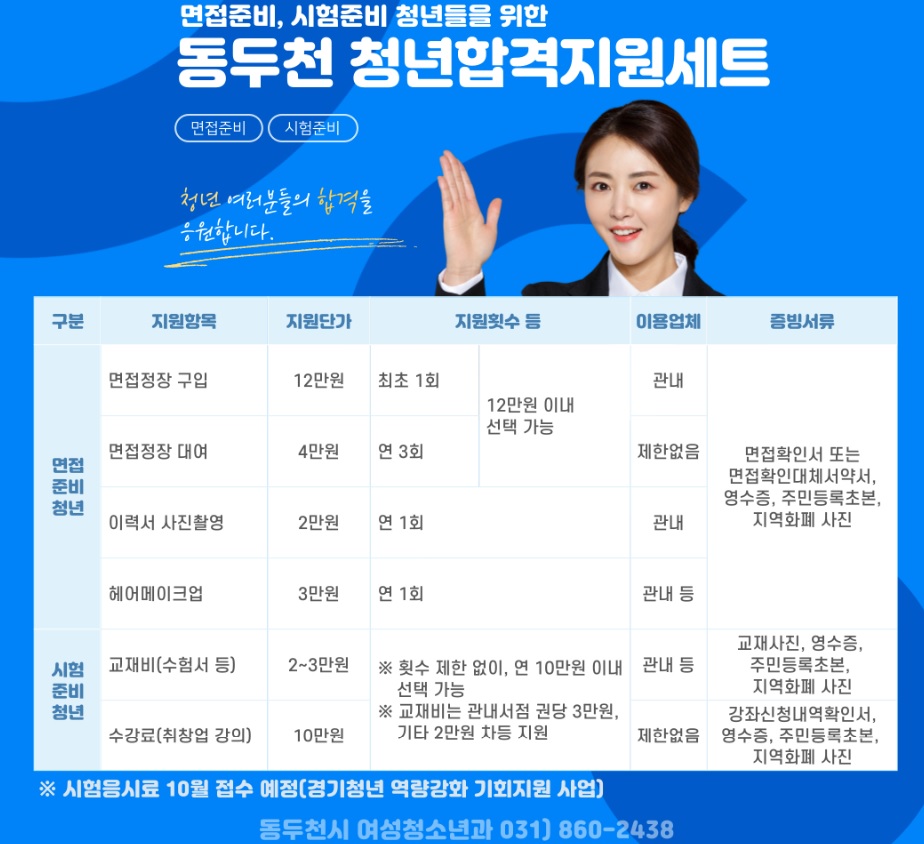 동두천시에서 청년들의 취업준비 부담을 경감하고, 구직활동을 촉진하기 위해 ‘청년구직비용 패키지 지원 (일명 동두천청년합격지원세트)’사업을 시행합니다. 면접을 앞둔 청년들에게는 정장과 사진촬영, 헤어·메이크업 비용과, 시험을 앞둔 청년들에게는 교재비와 수강료, 응시료까지 최대 27만 원을 지원하고 있습니다. 예산 소진 시 종료되니 서둘러 신청하시기 바랍니다. 아래에서 지원자격 및 신청방법을 알아보겠습니다.