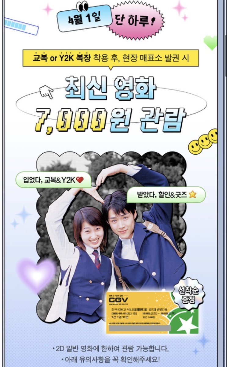 4 울 1일 만우절을 기념해 전국 CGV 고 낚시제 이벤트를 진행합니다. 낚시제란 즐거운 낙과 때 시를 따서 만든 이벤트명으로 CGV를 방문하는 고객이 즐거운 시간을 만끽하길 바라는 취지에서 시작했습니다. 만우절 당일 교복 또는 Y2K(2000년대) 의상을 입고 전국 CGV에 방문하면 일반 2D 영화를 7천 원에 관람할 수 있습니다. 그리고 추억의 디자인으로 제작된 티켓 굿즈도 선착순으로 받을 수 있습니다.