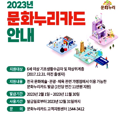 문화누리카드는 삶의 질 향상과 문화격차 완화를 위해 기초생활수급자, 차상위계층을 대상으로 문화예술, 국내여행, 체육활동을 지원하는 카드입니다. (2023년에는 1인당 연간 11만 원 지원) 문화누리카드는 기획재정부 복권위원회의 복권기금을 지원받아 추진하고 있는 공익사업입니다.