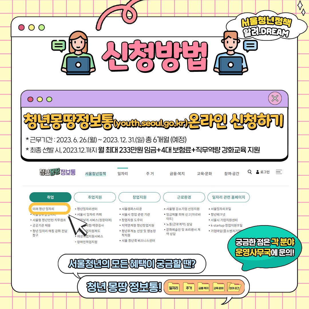 미래 청년 일자리 공고기간과 신청기간은 위 이미지와 같이 26일까지입니다. 청년 일자리 지원 방법은 서울시 공식 홈페이지에서 확인할 수 있습니다 온라인으로 신청할 수 있으니 자세한 내용은 홈페이지를 확인하시기 바랍니다