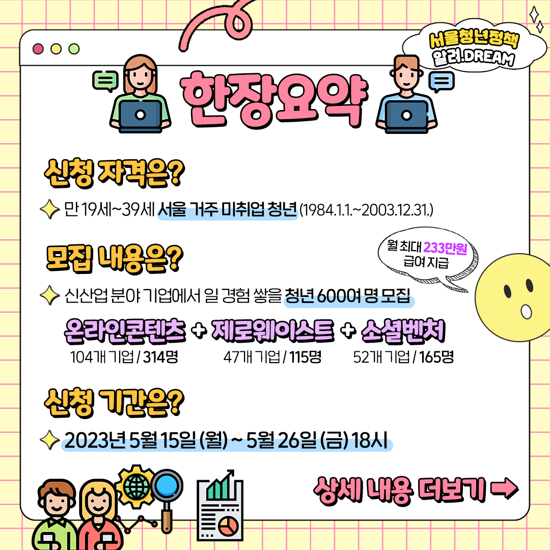 저는 오늘 서울의 미래 청년 일자리에 대한 정보를 공유하려고 합니다. 233만 원 임금에 600명을 모집하는 이 프로그램에 대하여 많은 분들이 관심을 가지고 계시지만 아마 모르는 분들도 계실 겁니다. 오늘, 저는 자세한 정보를 포함하여 미래의 청년 일자리에 대한 모든 정보를 전달하겠습니다!