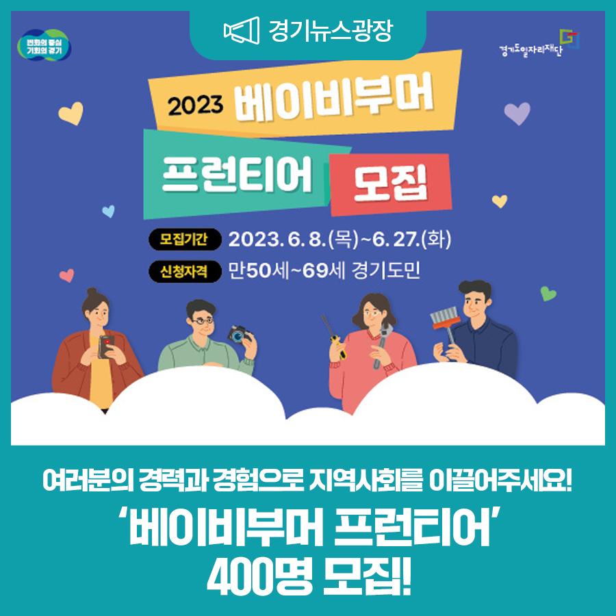 경기도에서 '베이비 부머 프런티어' 400명 모집합니다. 이번 "베이비 부머 프런티어" 사업은 민선 8기 베이비부머 기회 패키지 사업 중 하나로, 그간 정규직 취업 지원에 중점을 둔 정책에 이어 유연한 취업 지원을 시도한다는 측면에서 큰 의미가 있습니다. 자신이 가진 경험과 경력을 활용하여 지역 사회에 공헌하고자 하는 도내 베이비 부머들이 많이 참여해 주시길 바랍니다, "베이비 부머 프런티어"에 대해 더 자세히 살펴보겠습니다.