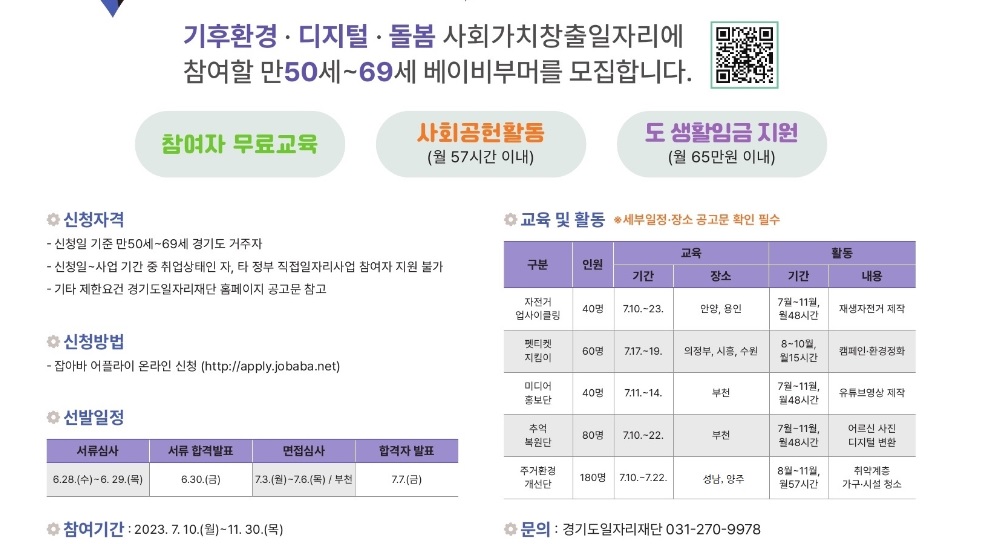 베이비부머 세대(1955년부터 1974년까지 출생자)의 경험과 경험을 활용하여 지역 사회 문제 해결에 기여하기 사회적 가치를 창출하는 일자리 프로젝트입니다.