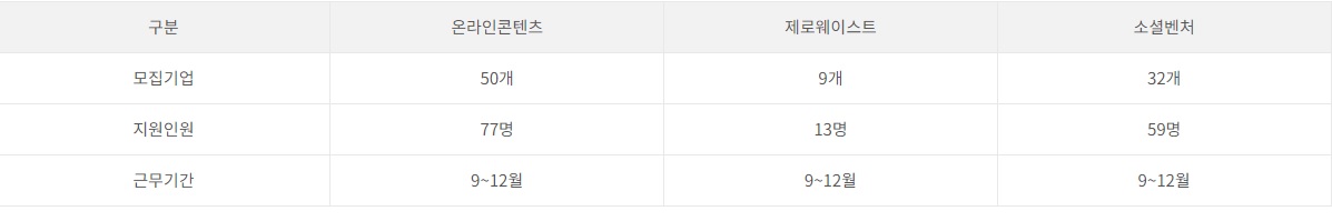 - 3대 분야(온라인 콘텐츠, 제로웨이스트, 소셜 벤처)에 해당하는 업무/업종의 기업