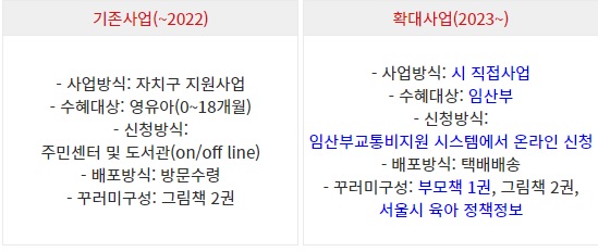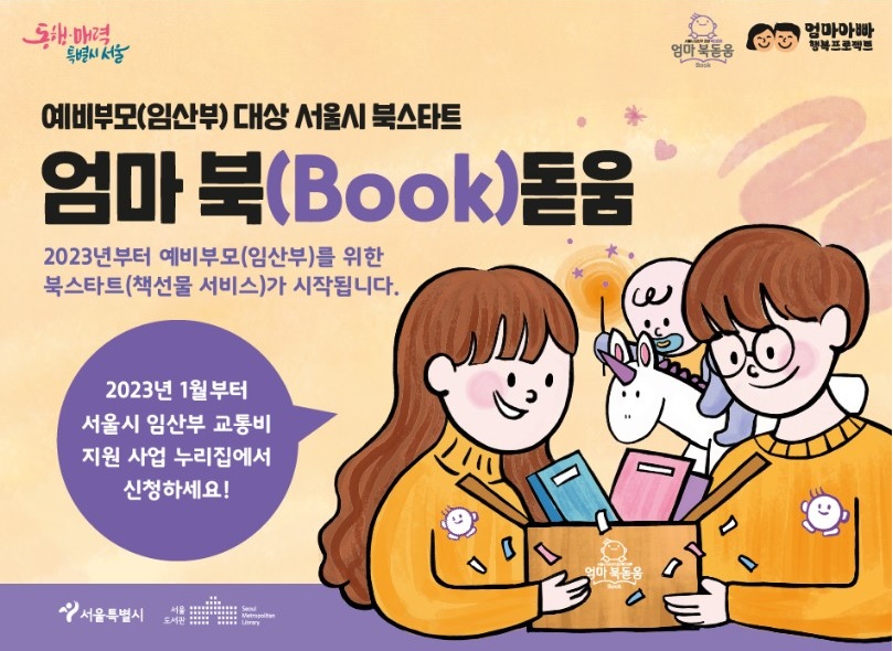 - 아기의 인생 첫출발을 책과 함께 시작할 수 있도록 지원하는 기존 사업을 확대하여 태아기부터 책과 함께 출발할 수 있도록 지원하는 사업입니다. 임산부에게 초기 양육을 위한 정보를 담은 예비부모책과 앞으로 태어날 우리 아이의 첫 번째 책뿐 아니라 서울시의 다양한 육아정보를 제공하여 예비부모(임산부)의 건강한 출산과 양육을 지원합니다
