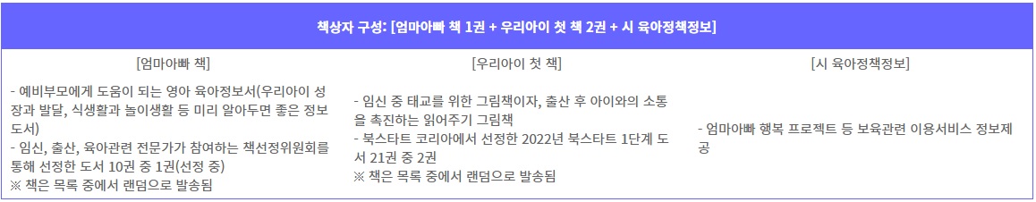 - 신청한 예비부모(임산부)에게 서울시 엄마 북돋움 책상자가 배송됩니다.