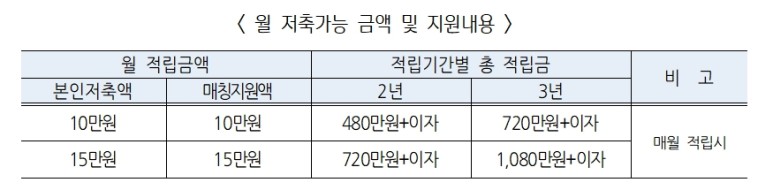 위에 표처럼 한 달에 10만 원이나 15만 원을 선택합니다. 10만 원을 선택하면 10만 원, 15만 원을 선택하면 매달 15만 원이 추가로 적립됩니다. 혜택을 많이 받으려면 3년간 15만 원을 내면 됩니다.