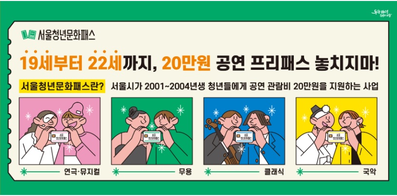 서울 청년 문화패스는 사회에 첫발을 내딛는 19~22세 청년들에게 연극, 뮤지컬, 클래식 오페라, 발레, 무용, 국악 등 공연 관람 기회를 제공하고, 문화예술 분야 활성화를 위해 문화이용권을 지원하는 사업입니다.