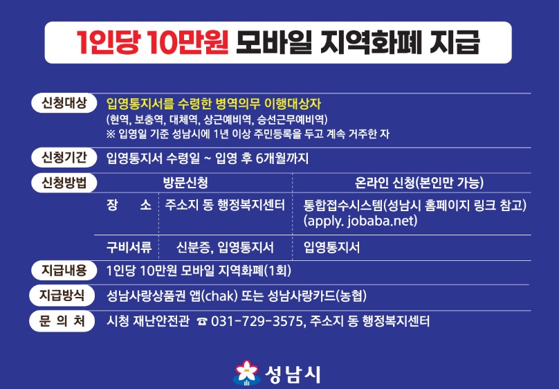 병역법에 따라 현역, 보충역, 대체역, 상근 예비역 또는 승선근무예비역으로 입영을 앞두고 있는 입영 예정자에게 성남시가 병역의무 이행을 격력 하고자 마련한 지원금입니다.