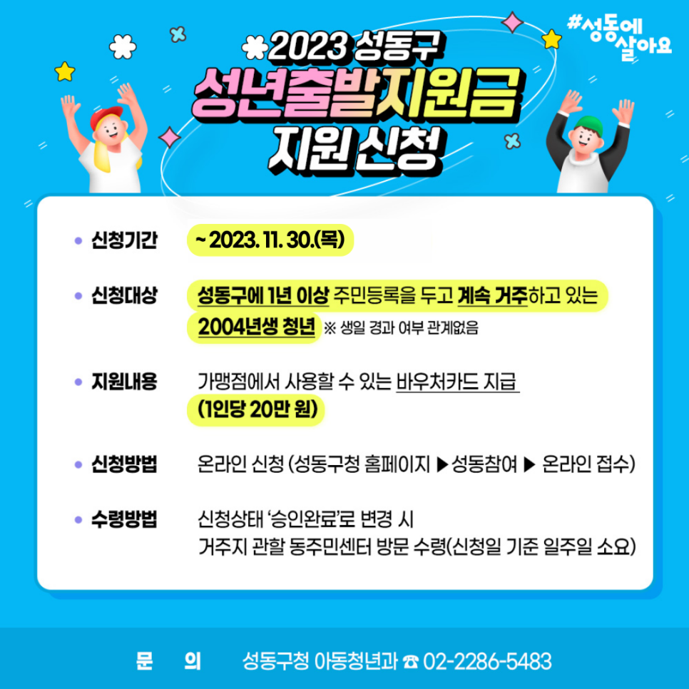 1. 신청 대상: 성동구에 1년 이상 주민등록을 두고 계속 거주하고 있는 2023년도에 만 19세가 되는 청년(2004년생)