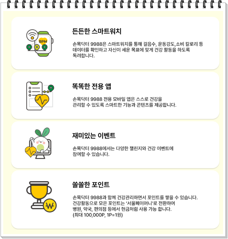 손목닥터 9988은 99세까지 88 하게 산다는 의미로, 서울시가 서울 시민의 주도적 건강관리 생활 습관형성과 건강 증진을 위해 제공하는 모바일 기반 비대면 건강관리 사업입니다. 스마트 워치와 9988 앱을 이용하게 되고 건강관리에 참여하게 된다면 달성도에 따라서 보상까지 지급해 주는 좋은 사업입니다.