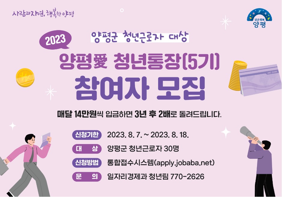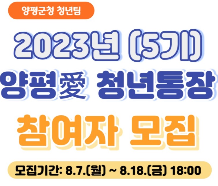 오늘은 양평 청년이라면 누구나 가입하고 싶어 한다는 그 통장, 양평애 청년통장 5기 참여자를 모집합니다. 신청방법 및 자격에 대해 알아보겠습니다. 모집인원은 30명만 선발될 예정이니 서둘러 신청하시길 바랍니다.