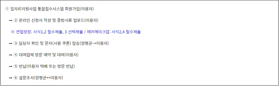 ※ 헤어메이크업의 경우 최소 3일 전 양평군에 신청서 제출 후 최소 2일 전 체인지레이디에 전화예약 필요. 부득이한 취소 시 최소 하루 전 체인지레이디에 전화필수. 당일취소, 노쇼의 경우 서비스 재참여 불가