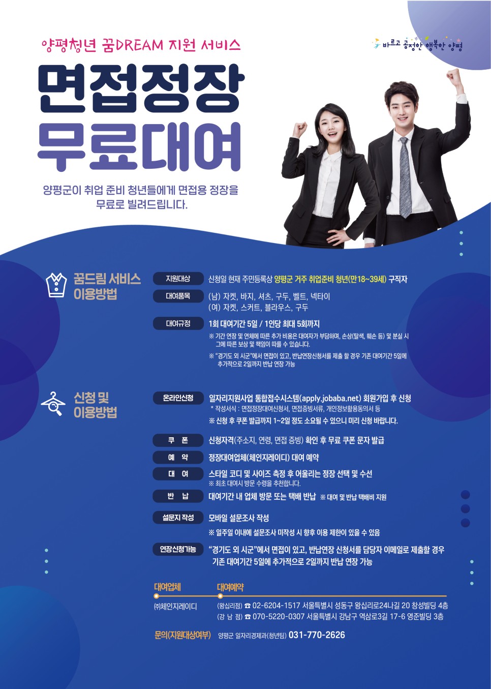 양평군에서 관내 취업 준비 청년들을 응원하기 위해 면접용 정장을 무료로 빌려주는 서비스를 합니다. 또 헤어메이크업까지 무료로 지원해 준다고 합니다. 사비로 하려면 많은 비용이 드는데 남자는 전액 무료이며 여자는 개인부담금이 있습니다. 예산소진 시 종료되니 서둘러 신청하시기 바랍니다. 아래에서 지원자격 및 신청방법을 알아보겠습니다.