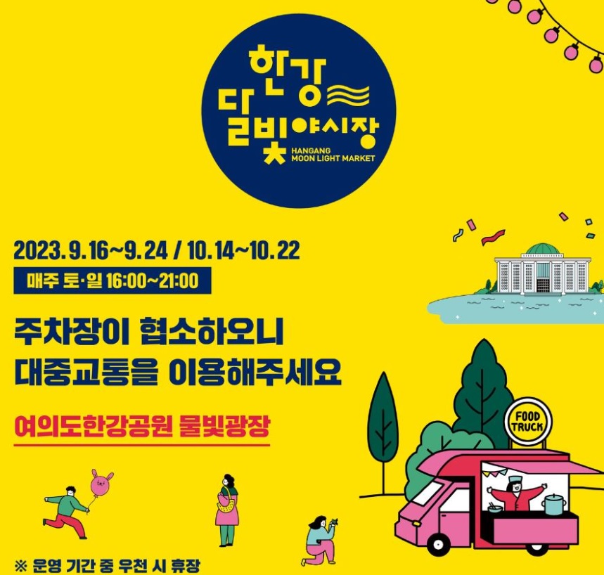 바람이 선선한 가을밤이 찾아왔습니다. 아이들과 그리고 가족과 연인과 이런 행복한 가을을 어디에서 즐길까 고민이시라면 2023 한강달빛야시장을 방문해 보시는 게 정말 좋을 것 같습니다. 주차장은 다소 협소하다지만 대중교통을 이용해서 즐겁게 다녀오세요. 감사합니다.