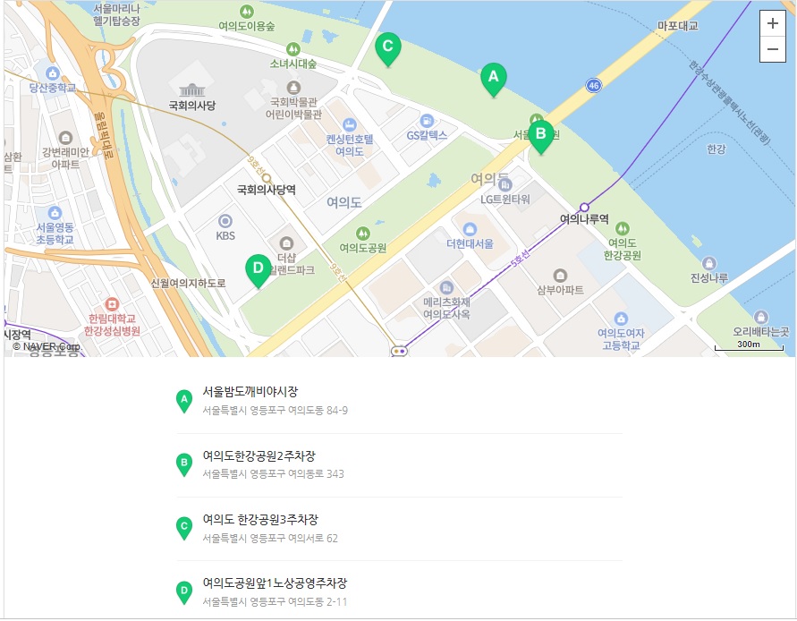 주차요금은 최초 30분에 2천 원이고 초고 10분당 300원입니다. 그리고 1일 최고 15,000원이네요. 주차장의 위치는 한강공원 2 주차장이 야시장에서 가장 가깝습니다. 그리고 여의도 공원 앞 1 노상공영 주차장은 상대적 야시장에서 거리가 멀지만 자리가 많은 편입니다.