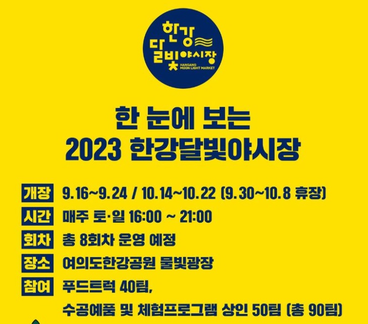 올해로 4년 만에 다시 돌아온 여의도한강달빛야시장입니다. 코로나19로 힘든 시기를 보내고 있는 우리에게 달빛 아래에서의 특별한 밤을 선물해 주는 건 어떠세요? 가을의 선선한 밤바람과 함께 여의도와 반포한강공원에서 즐기는 특별한 야시장, 놓치면 후회할 행사입니다. 2023년 한강 달빛 야시장 여의도(밤도깨비 야시장)의 행사 기간, 장소, 시간 등의 기본정보와 주차장 및 주차 비용 등을 알아보겠습니다.