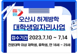 오산시에서 대학생들에게 등록금 부담을 낮추기 위해 방학 중에 일할 수 있는 사업을 진행하니 기간을 놓치지 말고 꼭 신청해 보시면 좋겠습니다. 좋은 결과가 있으면 좋겠습니다. 감사합니다
