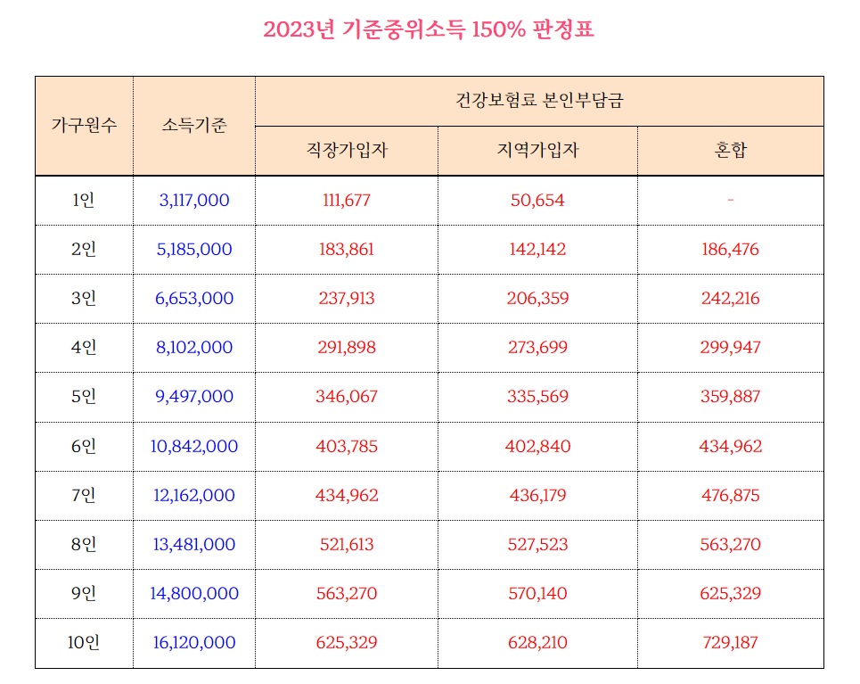 소득 : 기준중위소득 150% 이하(건강보험료 납부액 기준)