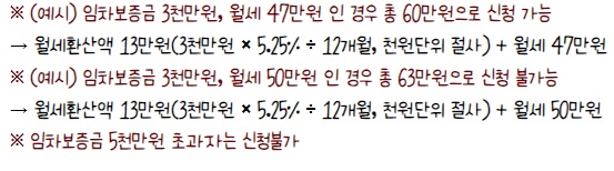 〇 월세가 40만 원을 초과하더라도 월세환산액(보증금 × 5.25% ÷ 12개월, 천 원 단위 절사)과 월세액 합산 61만 원 이하인 경우 신청할 수 있습니다