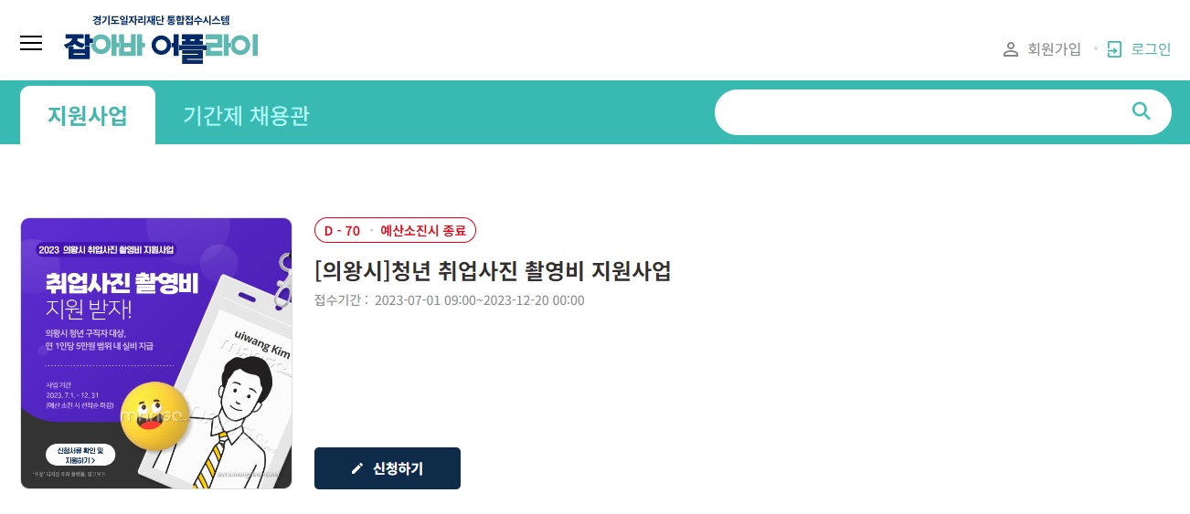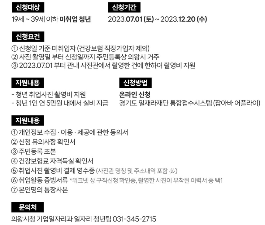 의왕시에서는 청년들의 취업 준비에 대한 경제적 부담을 완화하고 취업률 향상을 도모하고자 아래와 같이「청년 취업사진 촬영비」 5만 원을 지원합니다. 예산 소진 시 조기종료 되니 서둘러 신청하시기 바랍니다. 아래에서 지원자격 및 신청방법을 알아보겠습니다.