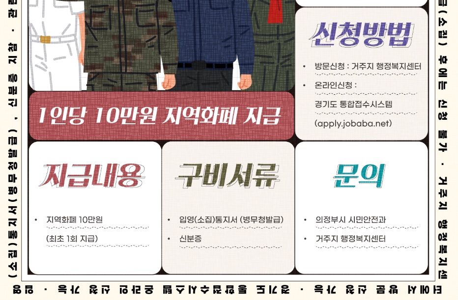의정부시 입영지원금 10만 원 지역화폐로 지급합니다. 최초 1회 지급하는 지원금입니다.
